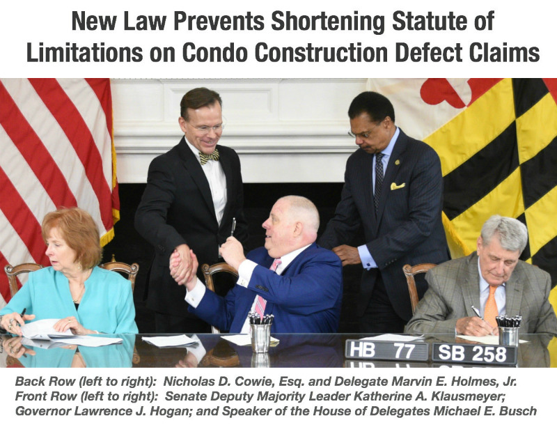 Note about Author:Nicholas D. Cowie, Esq., a partner in the law firm of Cowie Law Group, P.C., is the author of HB 77 and SB 258. Mr. Cowie worked closely with the bill’s sponsors, Delegate Marvin E. Holmes, Jr. and Senator Delores G. Kelley, and with the support of many other organizations, government agencies, and individuals to obtain passage of this important legislation. An article discussing this important legislation drafted by attorney, Nicholas D. Cowie which benefits Maryland condominiums and HOAs, was published in the Beacon, a Community Associations Institute publication for the Chesapeake Region Chapter covering Maryland and Delaware. See, New Laws Prevent Shortening Statute of Limitation’s on Maryland Condominium Construction Defect Warranty Claims.